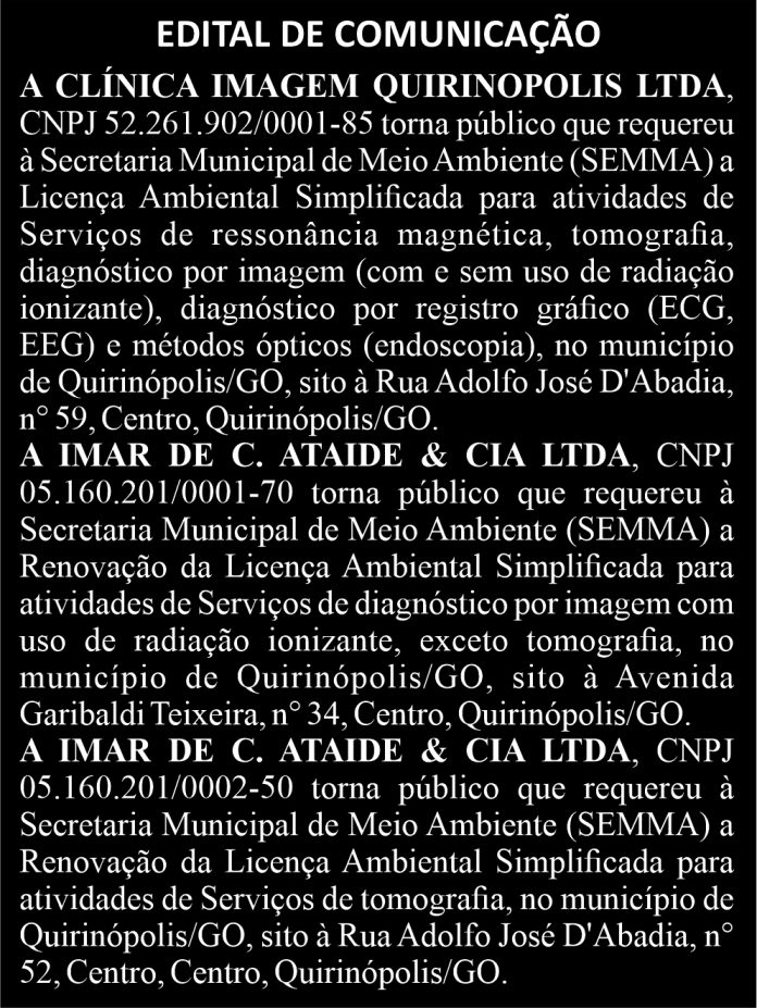 InícioEditaisEDITAL DE COMUNICAÇÃO DE LICENÇA AMBIENTALEditaisEDITAL DE COMUNICAÇÃO DE LICENÇA AMBIENTALBy Jornal Impar27 de janeiro de 20260121CompartilhadoFacebookTwitterPinterestWhatsApp EMPRESA:A CLÍNICA IMAGEM QUIRINOPOLIS LTDA, CNPJ 52.261.902/0001-85A IMAR DE C. ATAIDE & CIA LTDA, CNPJ 05.160.201/0001-70A IMAR DE C. ATAIDE & CIA LTDA, CNPJ 05.160.201/0002-50CompartilhadoFacebookTwitterPinterestWhatsApp Artigo anteriorBombeiro é atacado por pitbull enquanto caminha com filho de 10 meses em GoiâniaPróximo artigoQUIRINÓPOLIS: Exercícios físicos e saúde mental são tema de palestra na PoliclínicaJornal Imparhttps://jornalimpar.com.brRELATED ARTICLES EditaisEDITAL DE COMUNICAÇÃO DE LIÇENCA AMBIENTAL 16 de abril de 2026 EditaisEDITAL DE COMUNICAÇÃO DE LIÇENCA AMBIENTAL 25 de março de 2026 EditaisEDITAL DE COMUNICAÇÃO DE LIÇENCA AMBIENTAL 20 de março de 2026 DEIXE UMA RESPOSTA Cancelar respostaComente:Por favor, insira seu comentário! Nome:*Por favor, digite seu nome aqui E-mail:*Você digitou um endereço de e-mail incorreto!Por favor, digite seu endereço de e-mail aqui Local na rede Internet: Salve meu nome, e-mail e site neste navegador para a próxima vez que eu comentar. Most PopularQUIRINÓPOLIS: Homem é preso em flagrante por descumprir medida protetiva de urgência contra irmão 16 de abril de 2026 Polícia Civil prende em flagrante pai suspeito de estuprar o filho em Minaçu 16 de abril de 2026 Goiás vira modelo nacional e inspira ampliação do diagnóstico de câncer de mama no SUS 16 de abril de 2026 EDITAL DE COMUNICAÇÃO DE LIÇENCA AMBIENTAL 16 de abril de 2026 Carregue maisRecent Comments