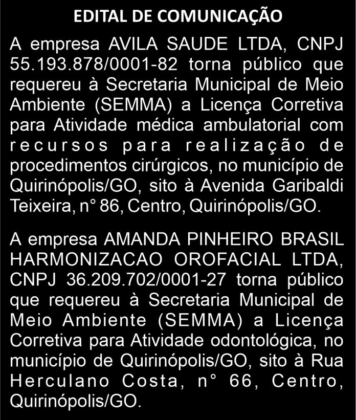 InícioEditaisEDITAL DE COMUNICAÇÃO DE LIÇENCA AMBIENTAL