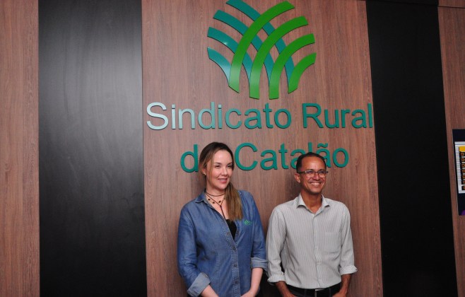 A Gestora Comercial e de Marketing do Sindicato Rural, Cris Terra ao lado do presidente Ricardo Pires Monteiro detalhando detalhes sobre a Expo Catalão 2025