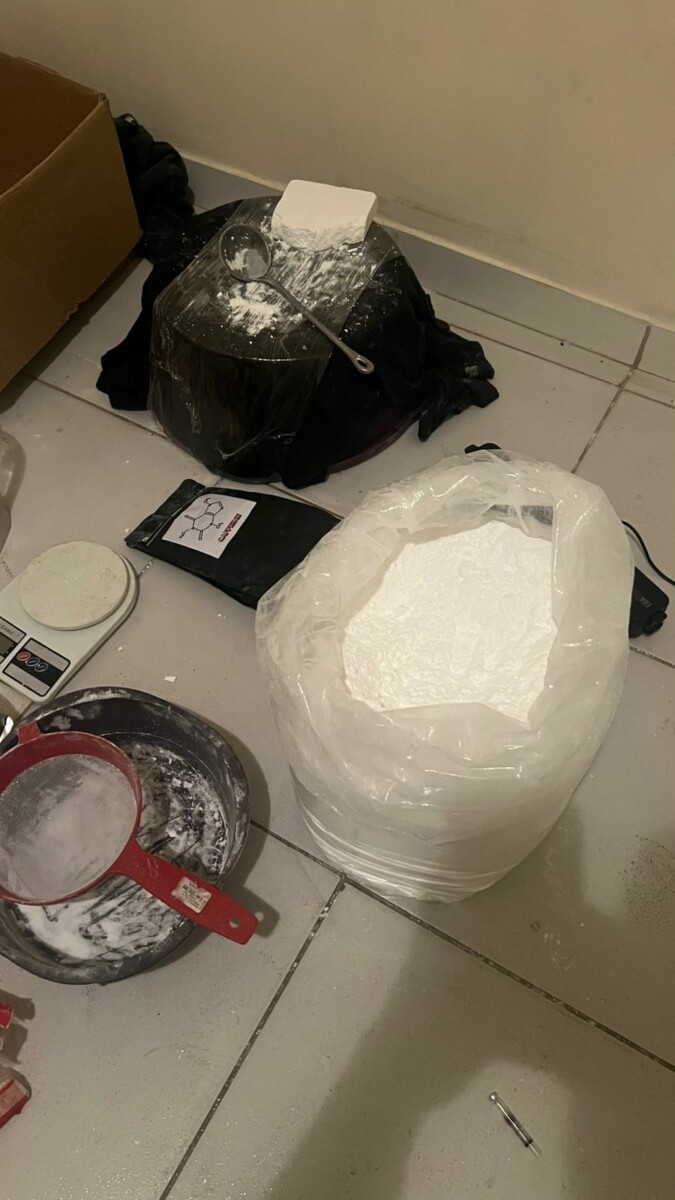 Também foram apreendidas balanças de precisão, utensílios utilizados no preparo e na mistura, embalagens para fracionamento e outros materiais empregados na atividade ilícita. Todo o material foi apreendido e encaminhado para perícia.