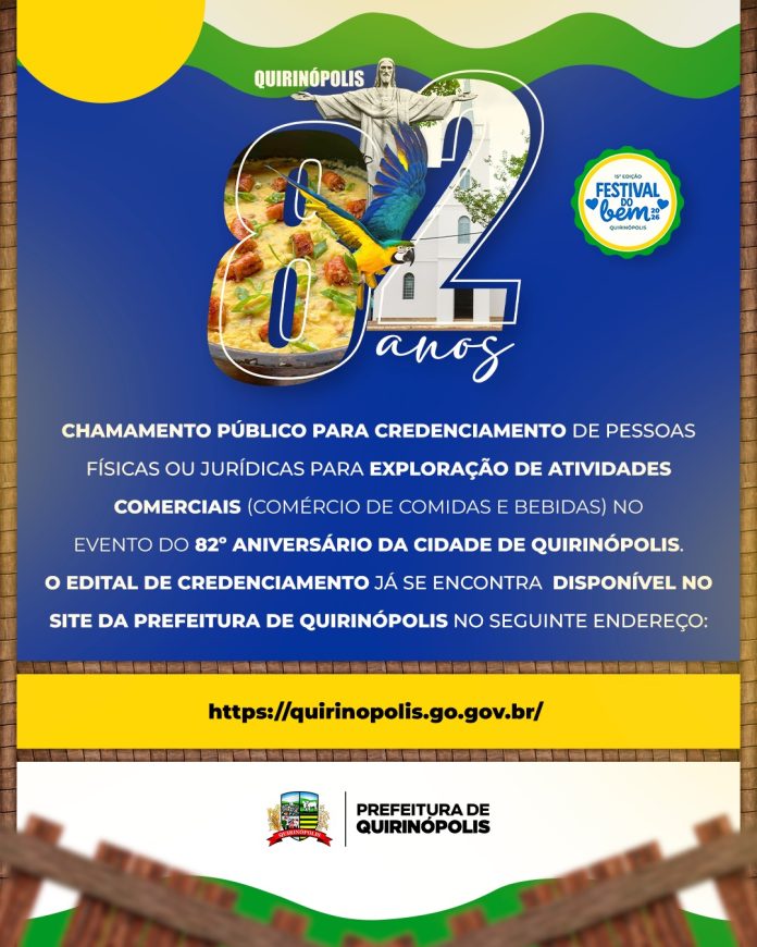 A Prefeitura de Quirinópolis publicou chamamento público para o credenciamento de pessoas físicas e jurídicas interessadas na exploração de atividades comerciais durante as festividades em comemoração aos 82 anos de emancipação do município.