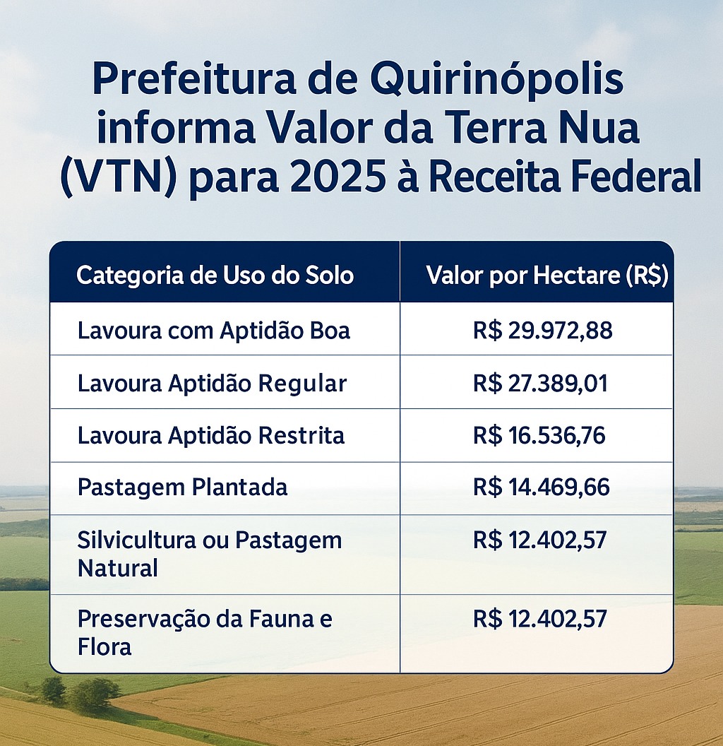 A Prefeitura de Quirinópolis encaminhou à Delegacia da Receita Federal de Rio Verde, no dia 30 de abril de 2025, as informações oficiais sobre o Valor da Terra Nua (VTN) no município para o ano vigente, conforme determina a Instrução Normativa RFB nº 1.877/2019.