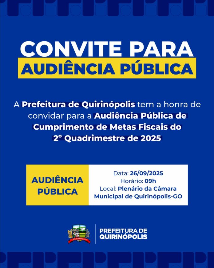 A Prefeitura de Quirinópolis convida a população para participar da Audiência Pública de Cumprimento de Metas Fiscais referente ao 2º quadrimestre de 2025. O encontro será realizado no próximo dia 26 de setembro, às 9h, no Plenário da Câmara Municipal de Quirinópolis.