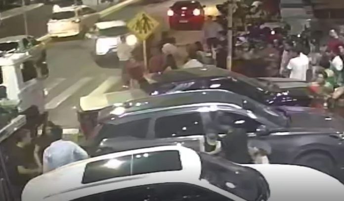 No vídeo de câmeras de segurança é possível ver o momento da confusão e mostra os envolvidos que parecem trocar agressões. Logo depois um carro vindo de ré avança contra o grupo de pessoas e depois sai do local.
