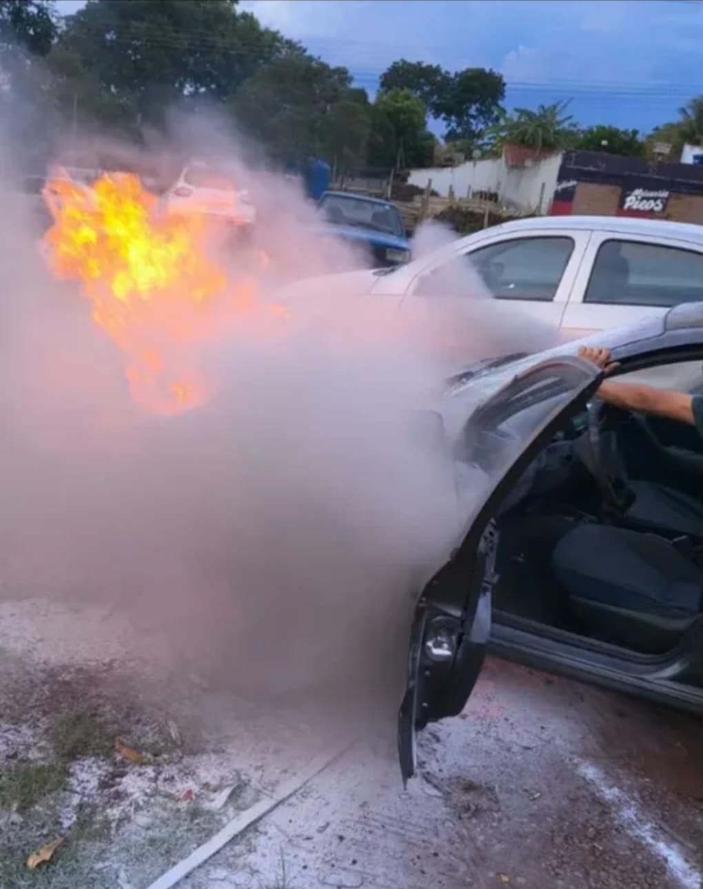 O fogo no veículo teve inicio no estacionamento do posto e segundo o proprietário, para evitar que o fogo pudesse atingir as instalações do posto, empurrou o carro para um gramado próximo, porém como era área de desnível, o veículo desceu até atravessar a Rodovia GO 206 e ficar preso no canteiro central.