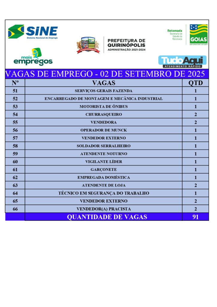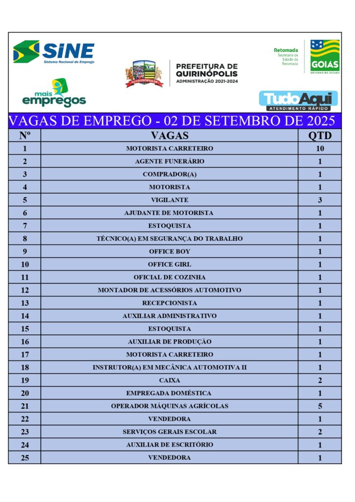 InícioDestaqueQUIRINÓPOLIS: VAGAS DE EMPREGODestaqueQuirinópolisQUIRINÓPOLIS: VAGAS DE EMPREGOBy Jornal Impar2 de setembro de 20250217CompartilhadoFacebookTwitterPinterestWhatsApp CompartilhadoFacebookTwitterPinterestWhatsApp Artigo anteriorCarga com mais de 500 produtos eletrônicos sem nota fiscal é apreendida na BR-153, em ItumbiaraPróximo artigoGoiás apresenta ferramentas de cuidado ao recém-nascido em seminário de segurança do pacienteJornal Imparhttps://jornalimpar.com.brRELATED ARTICLES DestaqueCaminhoneiro é preso com 2,5 toneladas de agrotóxicos contrabandeados em Goiás 24 de abril de 2026 DestaqueSÃO SIMÃO: PCGO prende em flagrante dois envolvidos na distribuição de drogas 23 de abril de 2026 DestaqueQUIRINÓPOLIS INICIA VACINAÇÃO CONTRA A DENGUE PARA CRIANÇAS E ADOLESCENTES DE 10 A 14 ANOS 23 de abril de 2026 DEIXE UMA RESPOSTA Cancelar respostaComente:Por favor, insira seu comentário! Nome:*Por favor, digite seu nome aqui E-mail:*Você digitou um endereço de e-mail incorreto!Por favor, digite seu endereço de e-mail aqui Local na rede Internet: Salve meu nome, e-mail e site neste navegador para a próxima vez que eu comentar. Most PopularCaminhoneiro é preso com 2,5 toneladas de agrotóxicos contrabandeados em Goiás 24 de abril de 2026 SÃO SIMÃO: PCGO prende em flagrante dois envolvidos na distribuição de drogas 23 de abril de 2026 QUIRINÓPOLIS INICIA VACINAÇÃO CONTRA A DENGUE PARA CRIANÇAS E ADOLESCENTES DE 10 A 14 ANOS 23 de abril de 2026 Operação Prognóstico – 2ª fase cumpre 16 mandados de busca contra núcleo financeiro de organização criminosa 23 de abril de 2026 Carregue maisRecent Comments